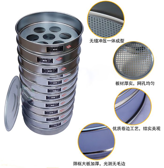 φ200mm (10只/套+底蓋)0.075、0.25、0.5、1.0、2.0、5、10、20、40、60mm標(biāo)準(zhǔn)篩框材質(zhì):由不銹鋼板、黃銅板、冷軋鐵皮(鍍鉻或鋅),塑料等材料構(gòu)成。采用一次沖壓成型,篩框平整、光潔度高、套篩組裝互換。